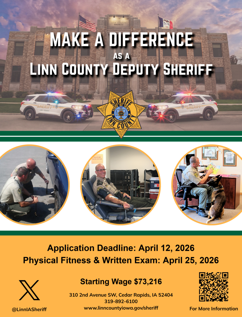 Linn County Hiring Deputy SheriffThe Linn County Sheriff’s Office is accepting Deputy Sheriff applications. The application deadline is Sunday, April 12, 2026. Applicants are also required to attend the Linn County Civil Service Commission physical fitness and written exam, which will be held on Saturday, April 25, 2026 at 8:00 AM at Coe College-Clark Racquet Center, 400 College Drive NE, Cedar Rapids, IA . For more information and to apply visit our recruitment page. The Linn County Sheriff’s Office has a lateral transfer program for certified law enforcement peace officers. This program includes a $10,000 structured incentive and a starting salary based on years of service as a certified peace officer. If you are interested in taking advantage of our lateral transfer program, please contact Major Matt Sandvick at 319-892-6105 or via email.