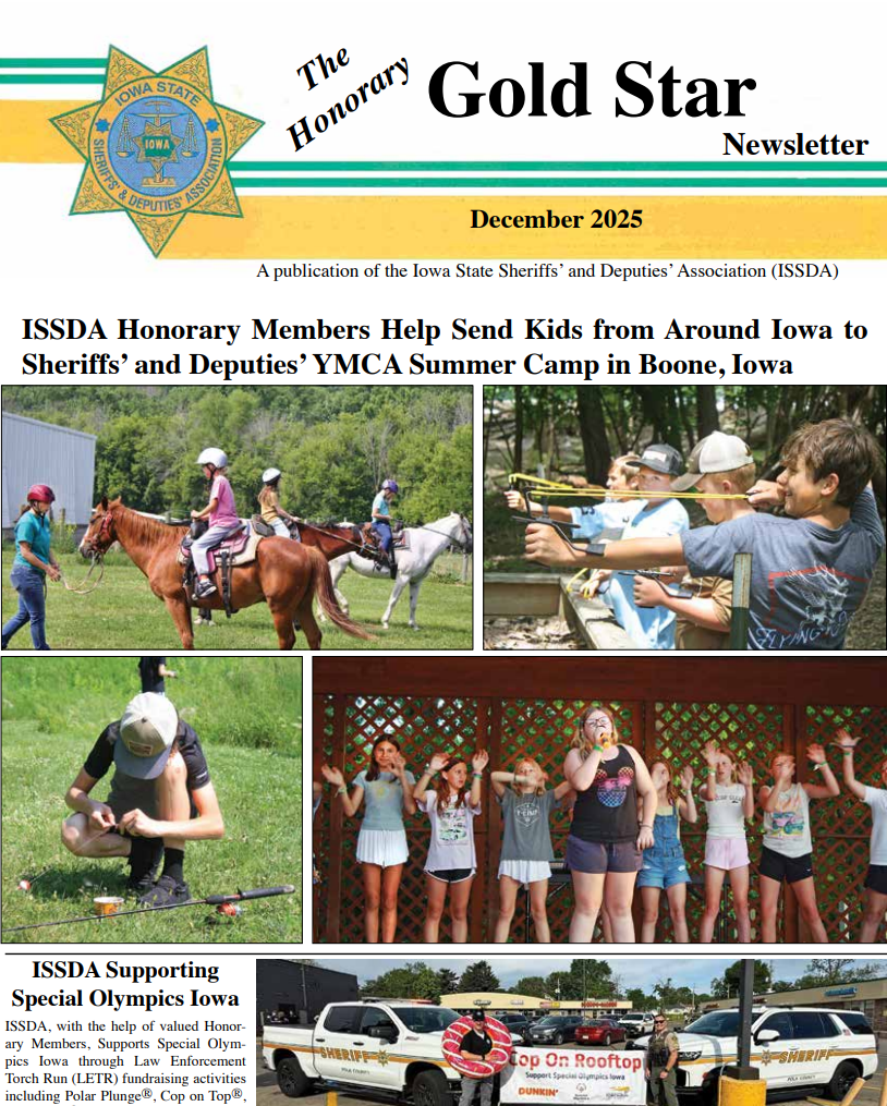 Honorary MembersPlease note that we never solicit memberships by telephone.Your membership dues help support training and education for Sheriffs, Deputies, Jailers and full time Sheriff's employees as well as a week-long YMCA camp for kids and Iowa Special Olympics. Your membership dues include a membership card, a bumper sticker, and a window decal as well as the Honorary Winter issue of The Gold Star Magazine. Business members will also receive a wall plaque. Your donations to the Iowa State Sheriffs & Deputies Association Institute are tax-deductible. ISSDAI sends kids from every county in Iowa to the YMCA Camp every summer. Your donations help support this great activity and gives 99 kids a chance to go to a wonderful summer camp... Questions can be sent to: [email protected] Thank you for your support!
